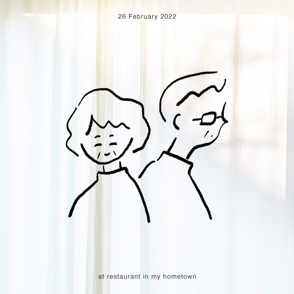 隣の席では老夫婦が食事をしている。二人が席を立つ時、杖をついたおじいさんは席を立つのが大変そう。おばあさんが「大丈夫ですか?」と敬語で話しかけている。モコモコの上着をソファーに広げていた私は、おじいさんの邪魔にならないように上着をどける。そしたらおばあさんが「ありがとうございます」と声をかけてくれた。