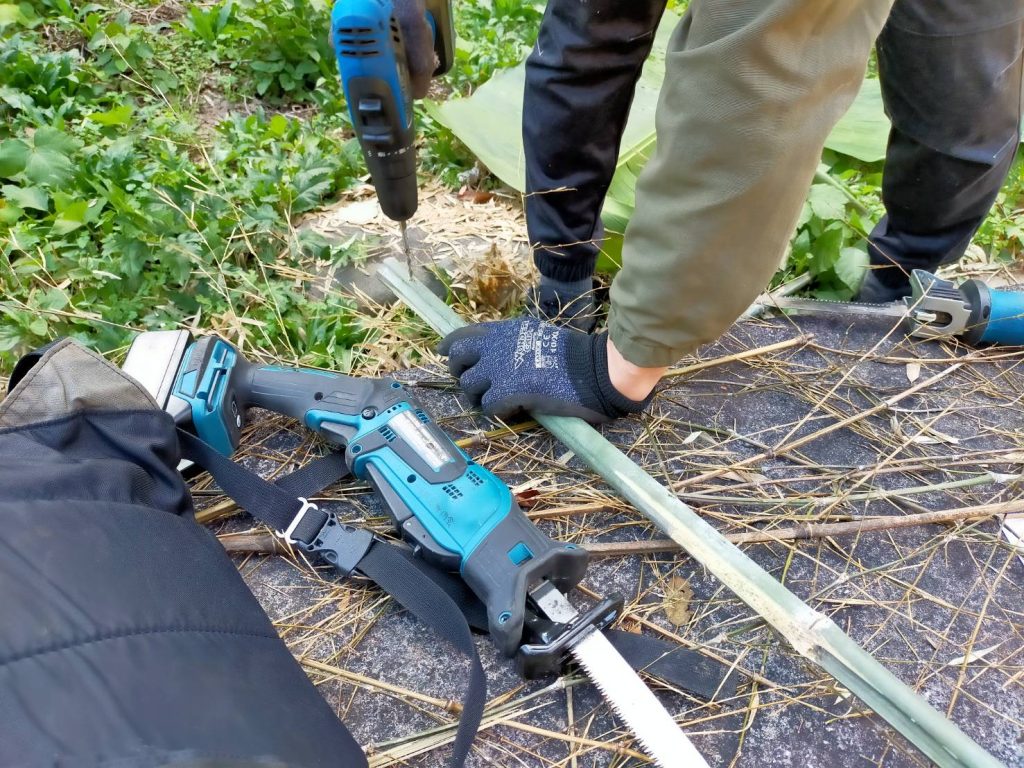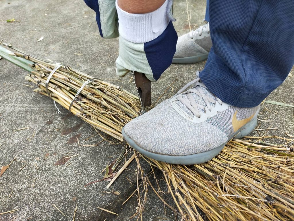 ばさばさの竹を針金でまとめていきます。簡単そうに見えるけど、やってみると力もいるしなかなか難しい。