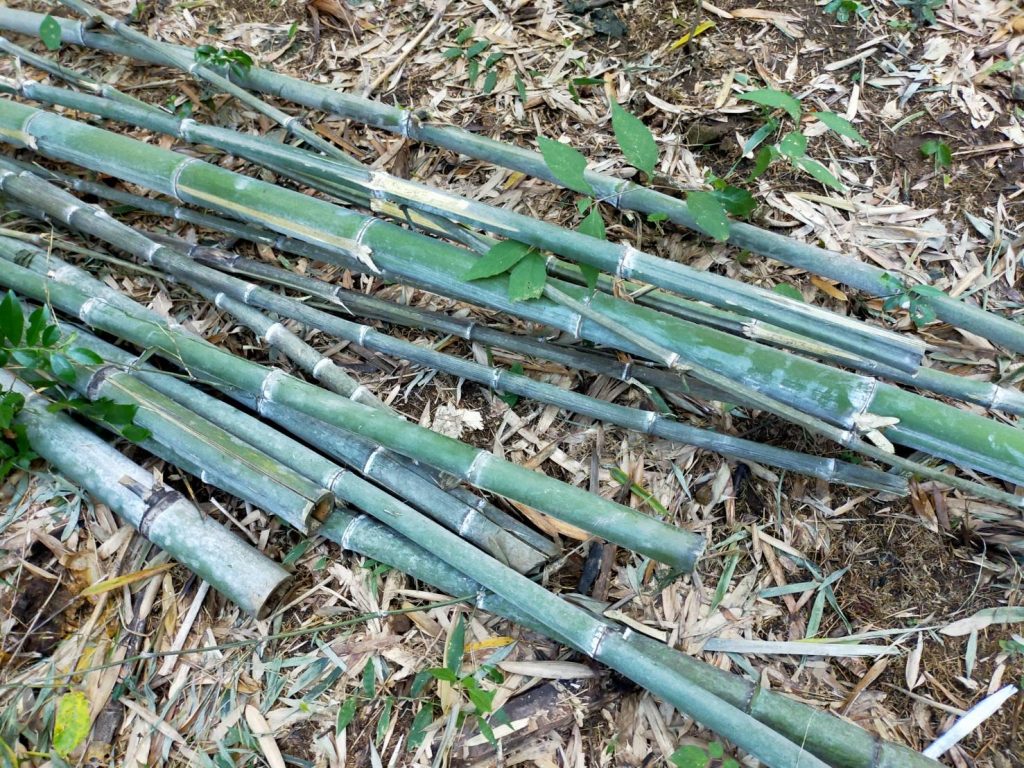 はじめに、切り倒した竹の中から、箒の柄にちょうど良いものを選びます。