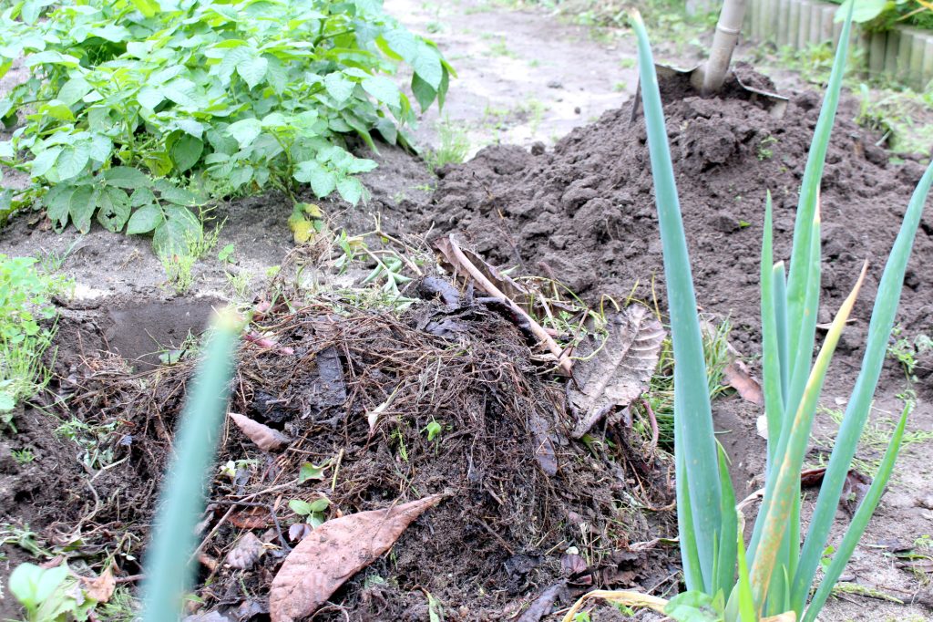 コンポストというと、何かしらの容器に野菜屑などを入れていくイメージがあるかと思いますが、実家では囲いなどは特に設けず、畑に穴を掘ってそこへ直接埋めていくスタイル。台所で出る野菜屑の他、畑にある木々の落ち葉や、抜いた雑草なども一緒に混ぜていきます。