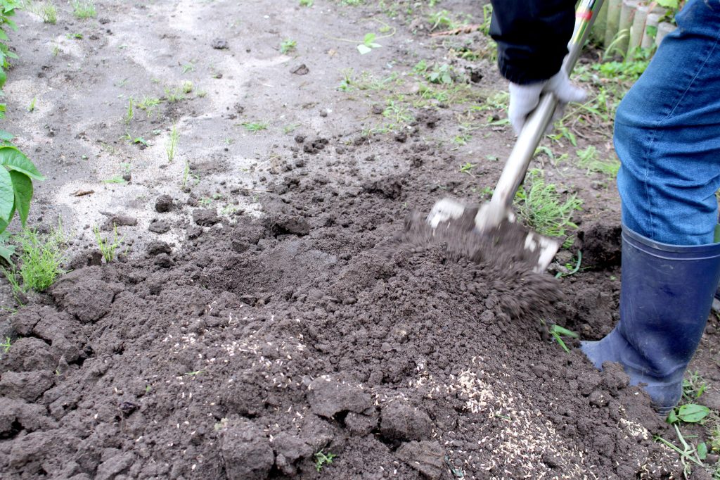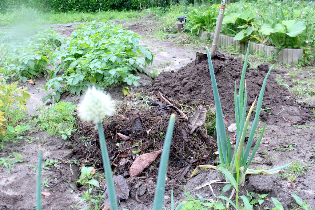さっと混ぜたらその場所はしばらく寝かせておき、また別の場所に穴を掘って埋めて行きます。