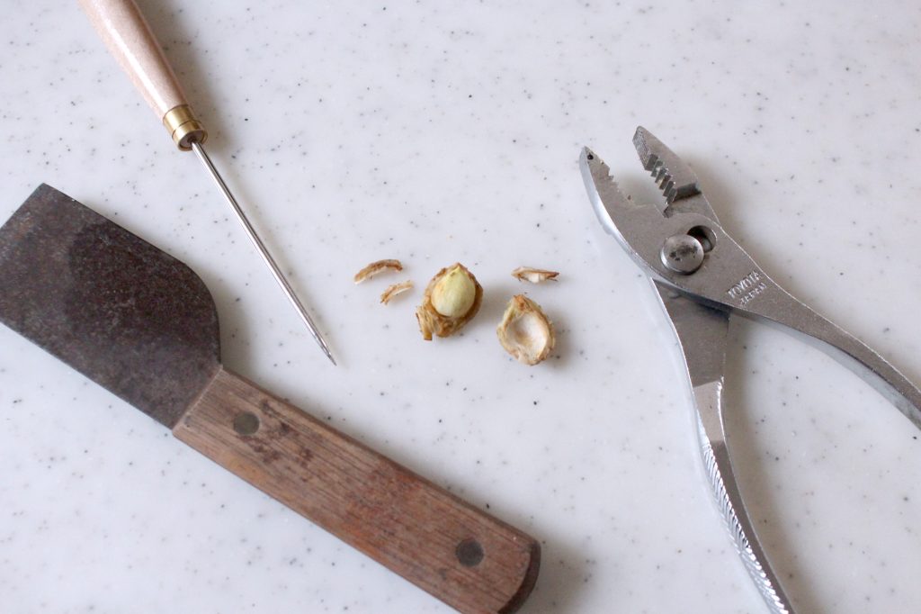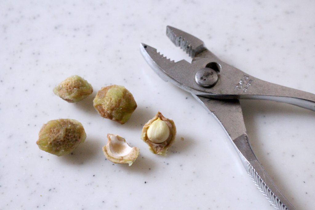 殻は硬くて素手ではなかなか割れないので、ペンチで割りました。中身を潰さないよう、場所を定めて慎重に。