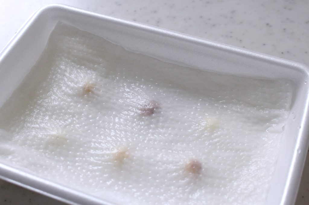 容器にキッチンペーパーを敷いて、水を入れて、種を置きます。